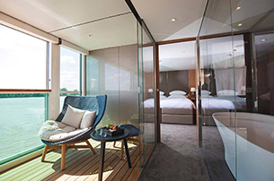 These contemporary Suites are located on the Sapphire and Diamond Decks. They include a private balcony with a 'Sun Lounge' along with individual climate control within the suite itself. The bedroom area has a Queen-size Scenic 'Slumber bed' with Egyptian cotton linen and pillow menu. The spacious bathrooms are with bath and shower and are well stocked with L'Occitaine toiletries as well as a hairdryer, bathrobes and slippers. The lounge area boasts a complimentary in-suite mini-bar, restocked daily. The suite has a Flat screen HDTV linked to Mac Mini, complementary WiFi and use of a telephone. A safe is also provided for your valuables.Guests staying within a Junior Suite will be provided with Butler service. This will include Valet service, shoe-shining as well as two items laundered/pressed daily. Breakfast can be delivered daily in suite along with Fruit skewers, drinks, pre-dinner canapés and post-dinner petit fours. Guests will also be invited to dine at Table La Rive.
